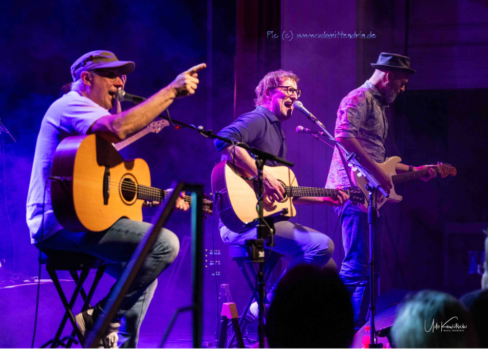 Wer kennt sie nicht: „Fürstenfeld“, „Großvater“ und „Irgendwann bleib i dann dort“ sind Stück Musikgeschichte pur. Von 1978 bis 2014 schrieb die Band S.T.S aus der Steiermark nicht nur diese Ohrwürmer, sondern viele weitere Hits. Die Band „Auf A Wort“ aus dem Chiemgau gründete sich 2008 und spielte seither auf über 450 Konzerten das Repertoire der des Trios Steinbäcker, Timischl und Schiffkowitz. Schuster (Peter, Gitarre, Mundharmonika), Rasch (Mathias, Gitarre) und Huber (Chris, Gitarre, E-Gitarre) knüpfen nahtlos an den Sound und Charme der Österreicher an und zelebrieren Austro Pop auf eine sehr authentische Art und Weise – so auch am vergangenen Freitag im wundervollen Ballhaus von Rosenheim.