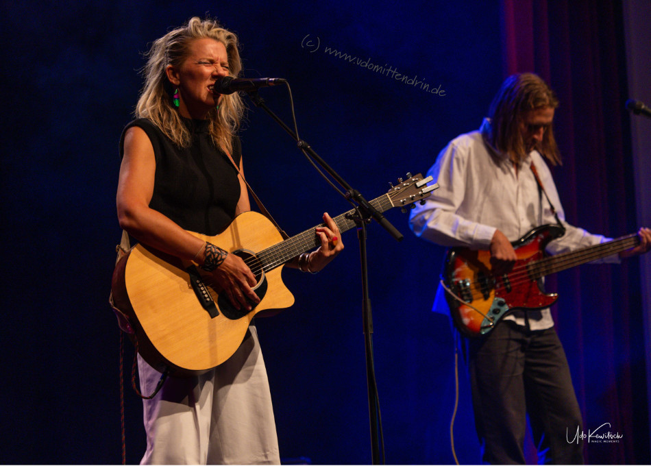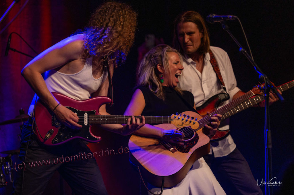 Toby Beard kam frisch eingeflogen aus ihrer Heimat Australien. Mit im Gepäck das neue Album „Here with me“ welches mit dem Song „Cyclone“ sogleich einen schwungvollen Anfang nahm. Die charismatische Stimme dieser Powerfrau und die unbändige Dynamik die sie mit sich trägt, springt ungefiltert aufs Publikum über. Einerlei ob melodisch feinfühlige Songs, wie das folgende „On the road“ oder das schwingende „Press rewind“ … die Band performt wie aus einem Guss. Vorneweg im Wortsinn tonangebend Tony Beard an der Akustik Gitarre, links und rechts flankiert von den Jungs an den Saiten: Max Lockitt (meist) am Bass sowie Jake Hatch an der E-Gitarre, bei dem ich mich schmunzelnd mitunter fragte: Epilepsie oder Ekstase? Letzteres wird zutreffend sein und bescheinigt die unbändige Leidenschaft der Musiker.