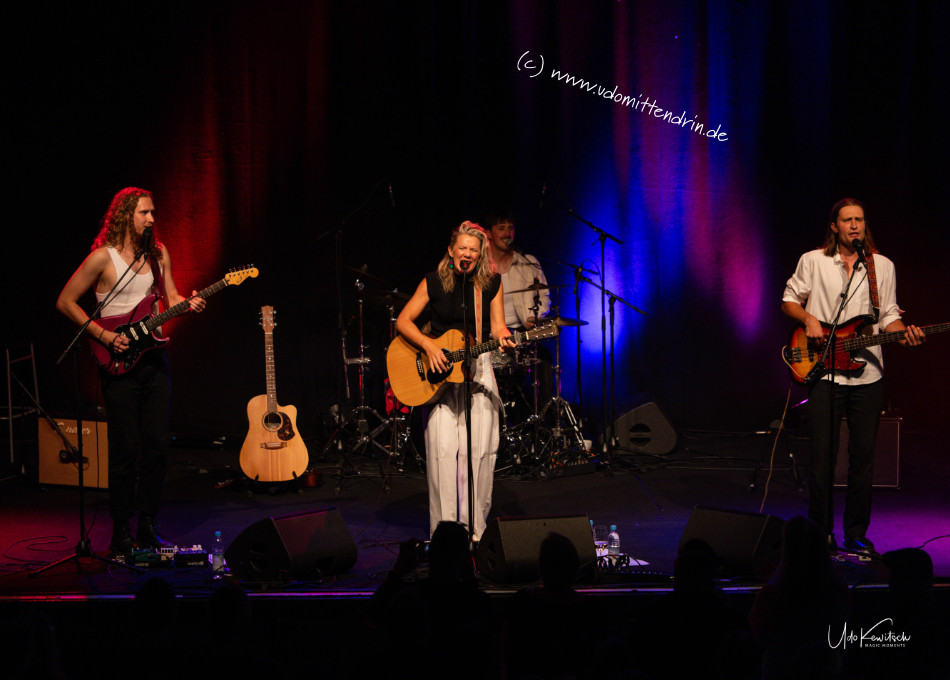 Toby Beard kam frisch eingeflogen aus ihrer Heimat Australien. Mit im Gepäck das neue Album „Here with me“ welches mit dem Song „Cyclone“ sogleich einen schwungvollen Anfang nahm. Die charismatische Stimme dieser Powerfrau und die unbändige Dynamik die sie mit sich trägt, springt ungefiltert aufs Publikum über. Einerlei ob melodisch feinfühlige Songs, wie das folgende „On the road“ oder das schwingende „Press rewind“ … die Band performt wie aus einem Guss. Vorneweg im Wortsinn tonangebend Tony Beard an der Akustik Gitarre, links und rechts flankiert von den Jungs an den Saiten: Max Lockitt (meist) am Bass sowie Jake Hatch an der E-Gitarre, bei dem ich mich schmunzelnd mitunter fragte: Epilepsie oder Ekstase? Letzteres wird zutreffend sein und bescheinigt die unbändige Leidenschaft der Musiker.